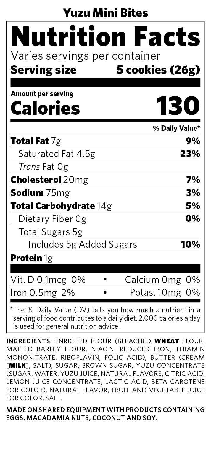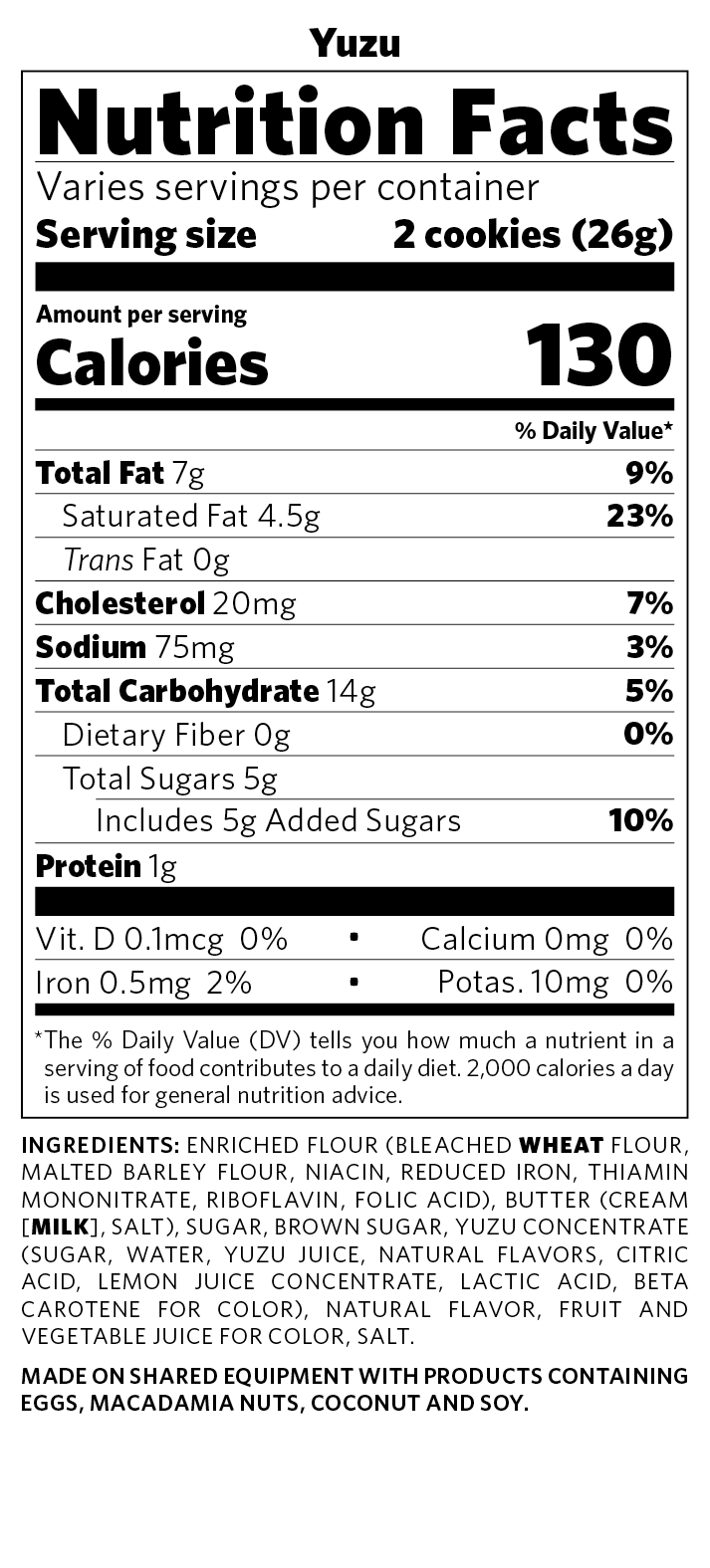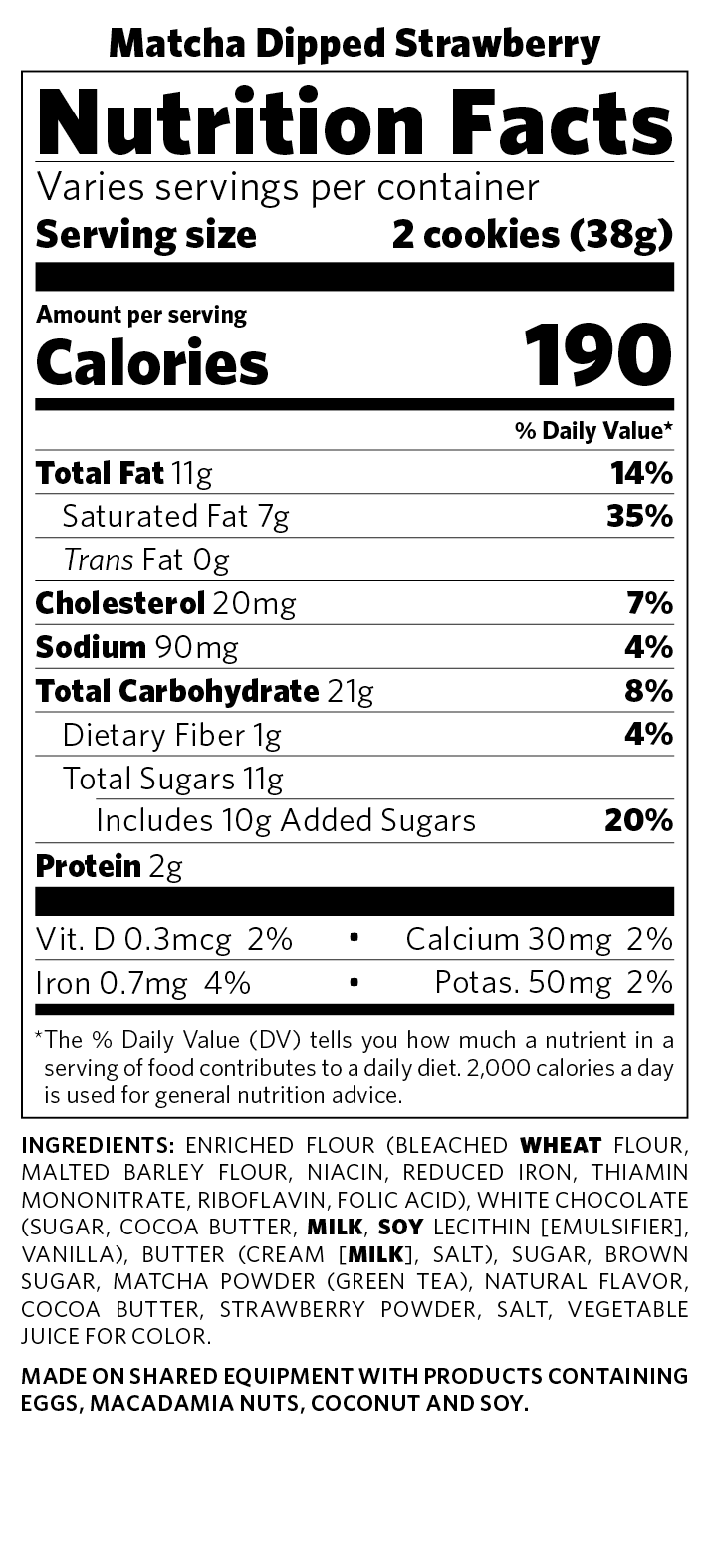 All cookies are made on shared equipment with products containing eggs, macadamia nuts, coconut and soy.
